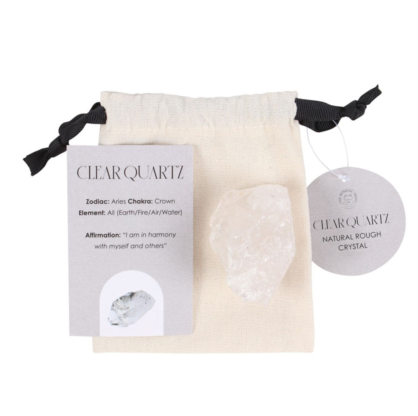 Clear quartz crystals are said to promote harmony and are commonly used as an aid in crystal healing. Harness its rumoured healing properties to clear mental blocks and protect against negative energies. Comes in a cotton drawstring pouch with matching information card. Size, shape and colour of stone will vary due to its unique nature.