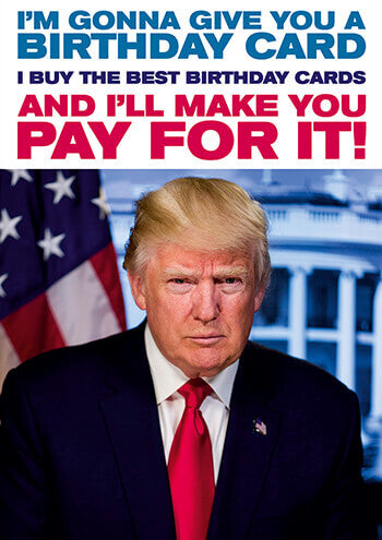 A birthday card with the official portrait of Donald Trump on the front. Above it reads I'm gonna give you a birthday card. I buy the best birthday cards. And I'll make you pay for it!