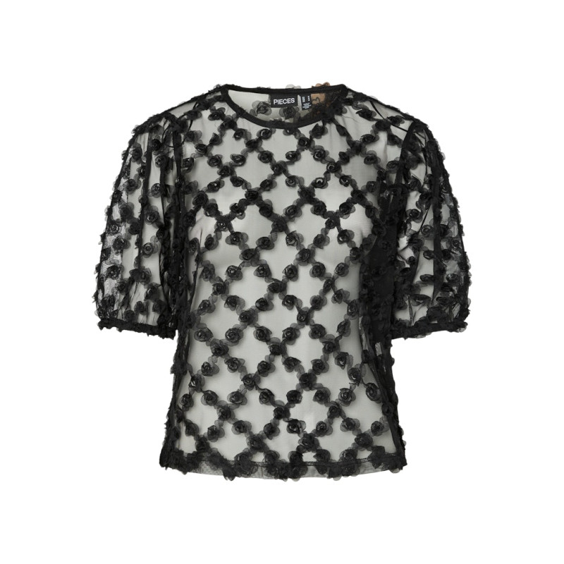 Create an elegant look with a semi-sheer top with a beautiful pattern and 2/4-length puff sleeves.