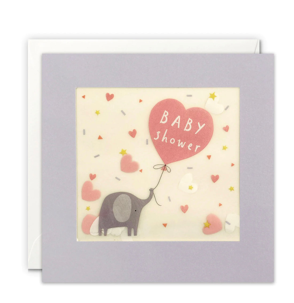 A hand finished baby shower card illustrated by Kate Mainard. The image on the front features a baby elephant holding a heart shaped balloon.