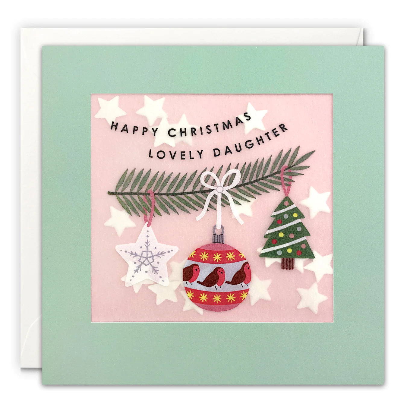The text on the front of the card reads 'Happy Christmas Lovely Daughter'. The message inside reads 'With love at Christmas'.