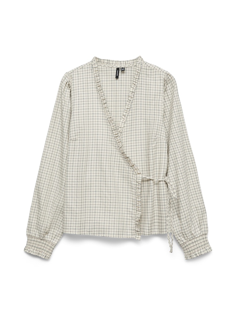 Embrace elegance with the Vero Moda Lova Wrap Top in Birch/Check Wine. Its flattering wrap design highlights your figure effortlessly. Perfect for adding a feminine touch, pair it with jeans and heels for a stylish, chic look.