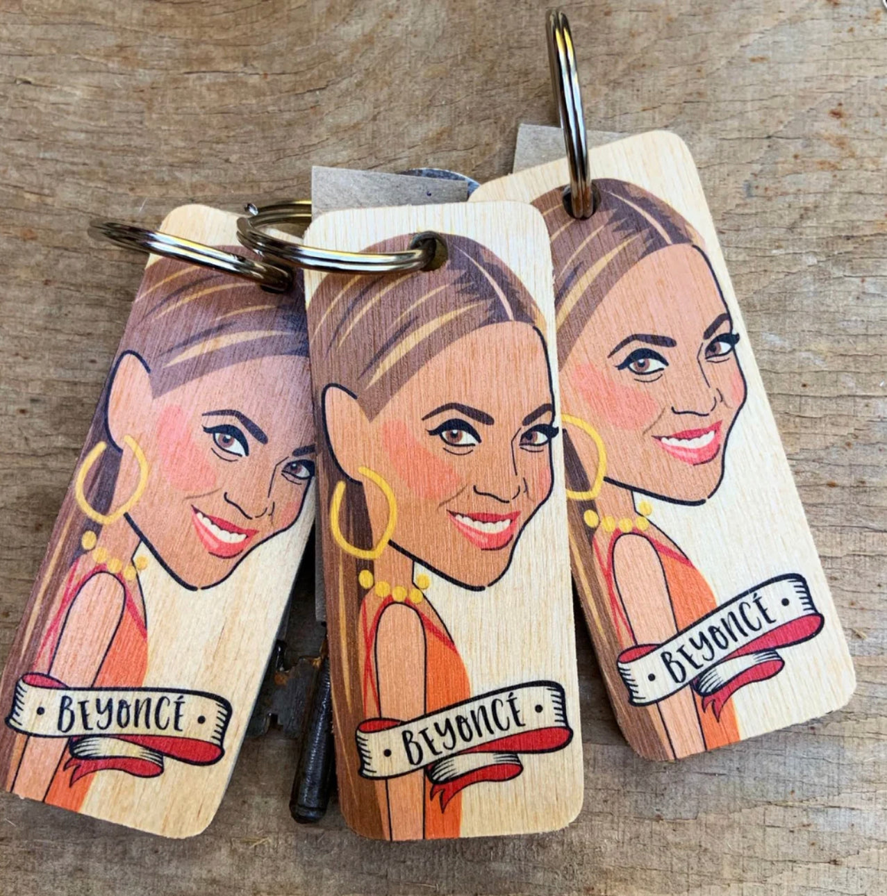 Fabulous illustrative wooden keyring capturing the likeness and spirit of the fabulous Beyonce. Drawn by our illustrator Jo Burrows in her own unique recognisable style. Natural wood rustic chunky keyring, each hand made by us so each one is completely unique. Water resistant and durable these items make a fantastic little gift. Comes with a swing ticket and split ring. Keyring size 90 x 35 mm.