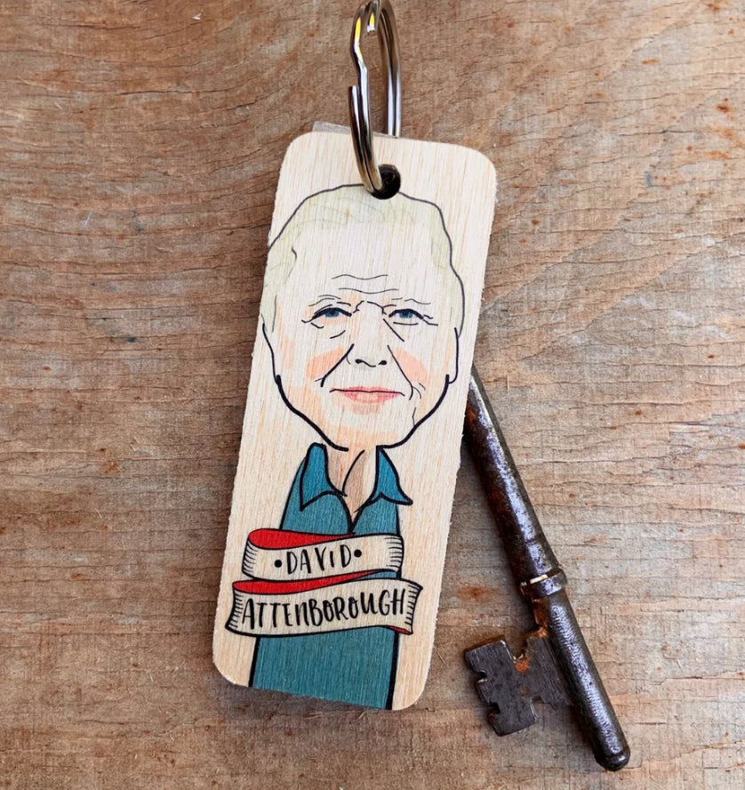 Fabulous illustrative wooden keyring capturing the likeness and spirit of David Attenborough.
