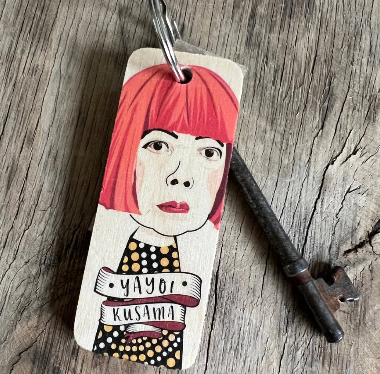 Fabulous illustrative wooden keyring capturing the likeness and spirit of Yayoi Kusama.